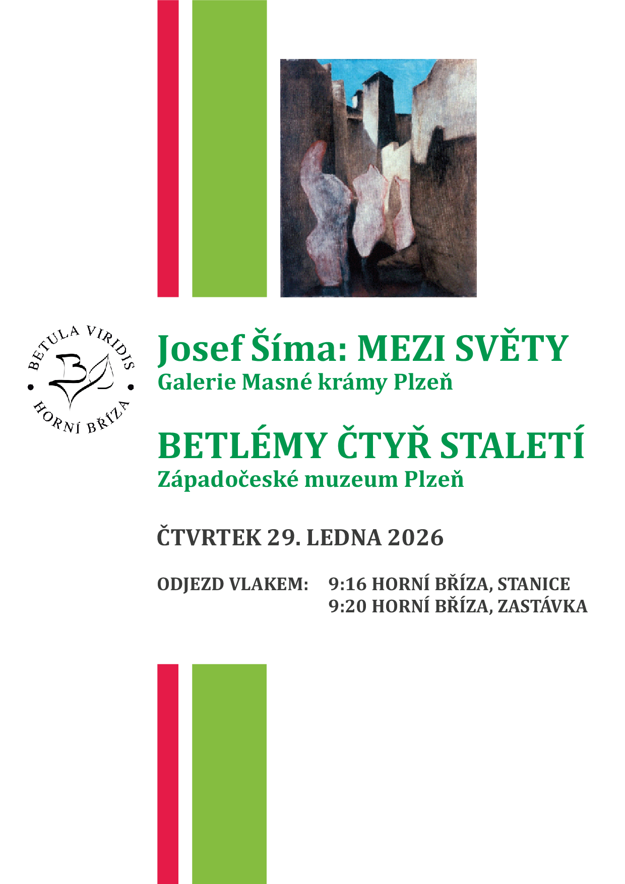 Spolek Betula viridis zve na zájezd do galerie Masné krámy na výstavu Mezi světy Josefa Šímy a a do Západočeského muzea v Plzni na výstavu Betlémy čtyř staletí. Zájezd se uskuteční ve čtvrtek 29. ledna 2026, odjezd je v 9:16 z vlakové stanice nebo v 9:20 ze zastávky Českých drah v Horní Bříze.