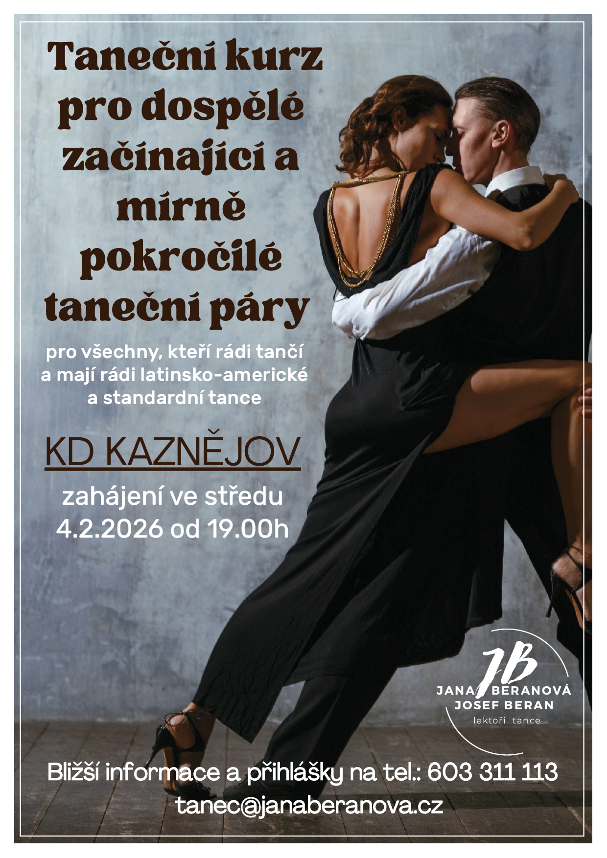 Taneční mistři Jana a Josef Beranovi zvou na taneční kurz pro dospělé začínající a mírně pokročilé taneční páry. Určeno pro všechny, kteří rádi tančí a mají rádi latinsko-americké a standardní tance. Kurz se uskuteční v KD Kaznějov, zahájení proběhne ve středu 4. února 2026 od 19:00. Bližší informace a přihlášky na telefonu 603 311 113 a na emailu...