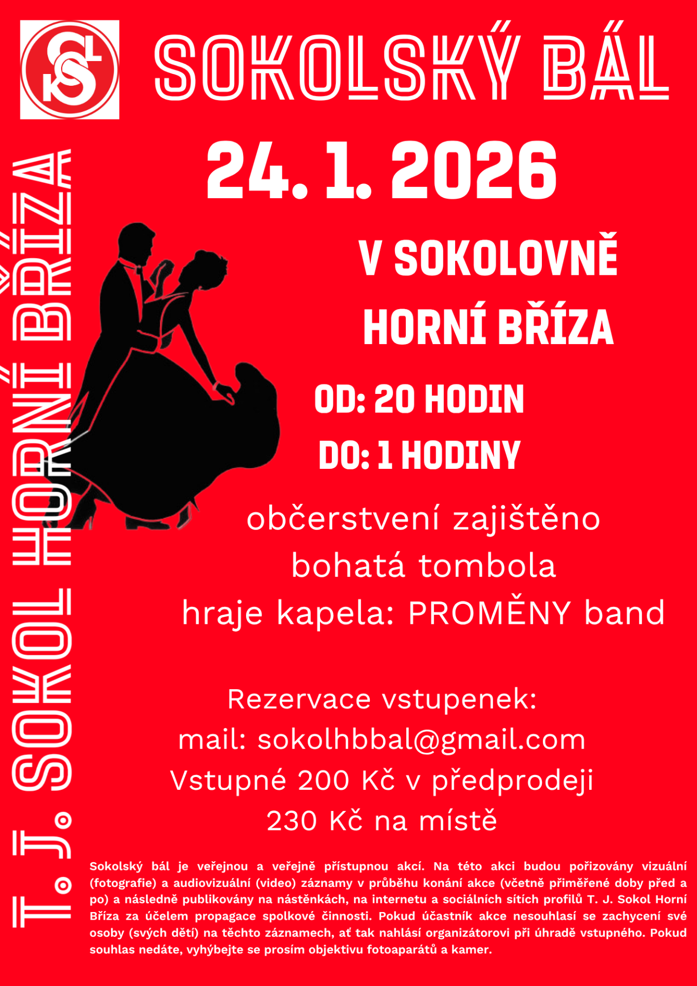Tělocvičná jednota Sokol Horní Bříza pořádá Sokolský bál, který se koná 24. ledna 2026 od 20:00 v sokolovně v Horní Bříze. Občerstvení zajištěno. Na programu bohatá tombola, k poslechu a tanci zahraje PROMĚNY band. Rezervace vstupenek sokolhbbal@gmail.com