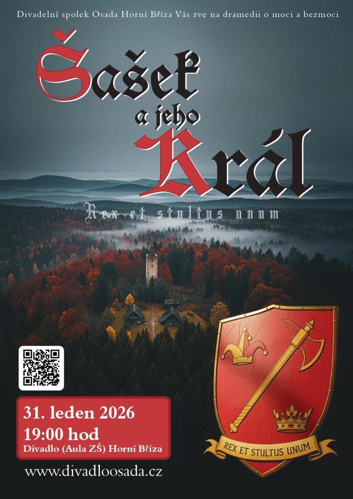 Divadlo Osada vás zve na dramedii o moci a bezmoci "Šašek a jeho král", které zahraje v sobotu 31. ledna 2026 od 19:00 v aule školy / Divadle Horní Bříza. Vstupné je 120 Kč. Doporučujeme rezervovat si místo na webu po kliknutí na plakát.