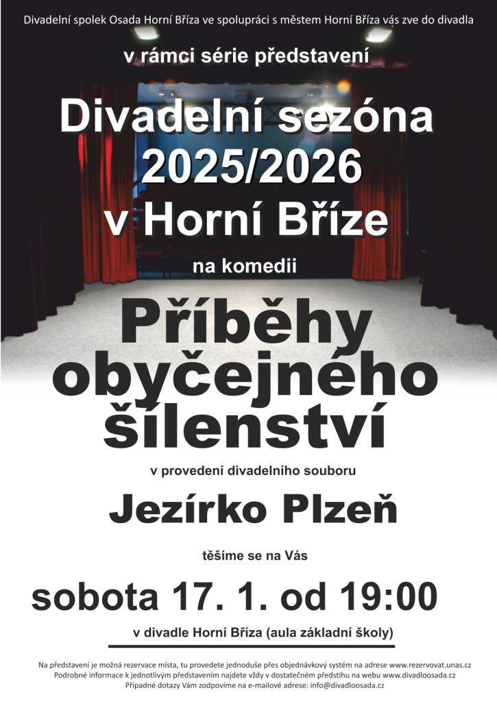Divadlo Osada vás zve na komedii "Příběhy obyčejného šílenství", které zahraje v sobotu 17. ledna 2026 od 19:00 v aule ZŠ / Divadle Horní Bříza hostující Divadlo Jezírko Plzeň. Vstupné je 120 Kč. Doporučujeme rezervovat si místo na webu po kliknutí na plakát.