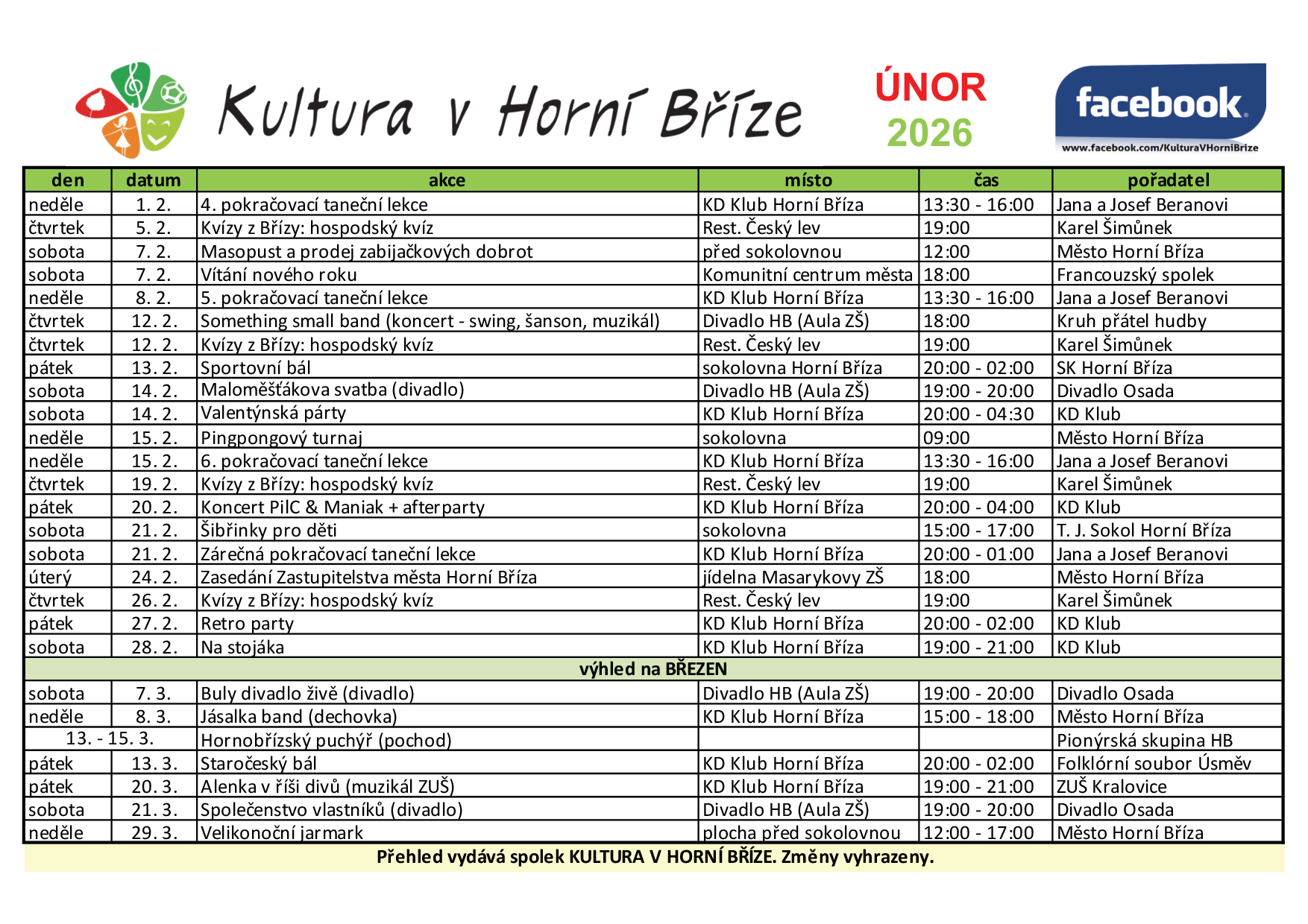 Přinášíme přehled akcí v Horní Bříze na měsíc únor s výhledem na březen.