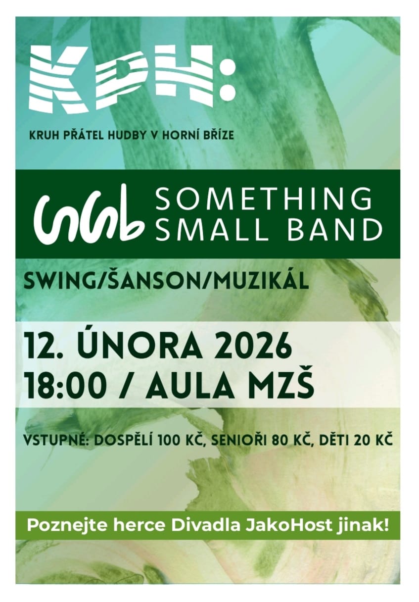 Kruh přátel hudby v Horní Bříze zve na koncert kvarteta Something Small Band, který se uskuteční ve čtvrtek 12. února 2026 od 18:00 v aule základní školy. Na programu je swing, šanson a hudba z muzikálu. Účinkuje herec Divadla JakoHost.