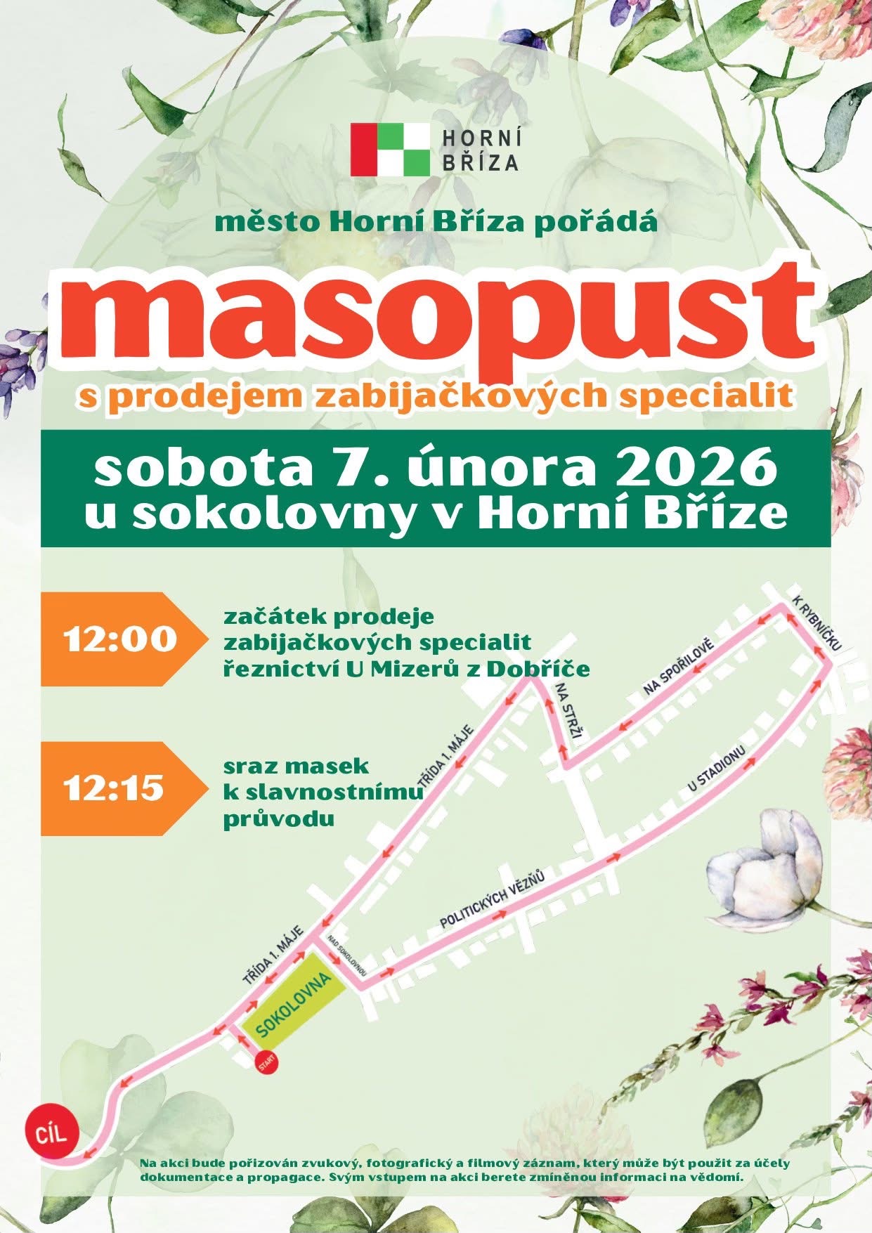 Město Horní Bříza pořádá v sobotu 7. února 2026 před sokolovnou Masopust a zabijačkové hody. Ve 12:00 začne prodej řeznických výrobků a občerstvení od řeznictví U Mizerů z Dobříče. Ve 12:15 je sraz masek. Průvod projde ulicemi mezi sokolovnou a fotbalovým hřištěm. Všichni jsou srdečně zváni.