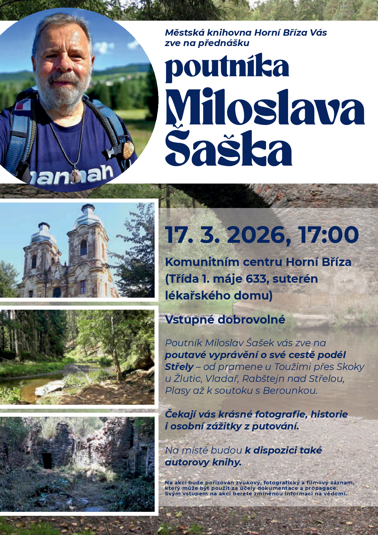 Knihovna města Horní Bříza zve na přednášku "Jak se fotí Šumava", která se koná 6. listopadu 2025 od 17:00 v aule/divadle Masarykovy základní školy Horní Bříza. Vstupné dobrovolné.