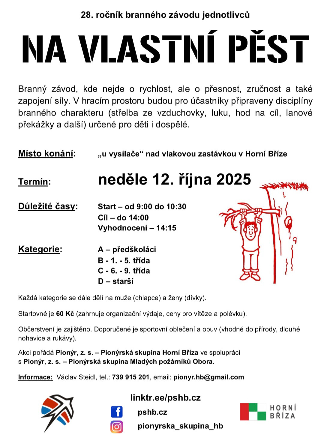 Pionýrská skupina Horní Bříza ve spolupráci s Pionýrskou skupinou Mladých požárníků Obora pořádá dne 12. října 2025 od 9:00 28. ročník branného závodu Na vlastní pěst, který se koná u vysílače nad vlakovou zastávkou.
