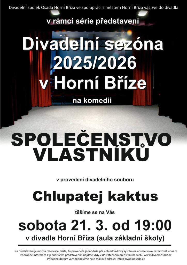 Divadlo Osada vás zve na komedii "Společenstvo vlastníků", kterou zahraje tuto sobotu 21. března 2026 od 19:00 v aule MZŠ divadelní soubor Chlupatej kaktus. Vstupné je 120 Kč. Doporučujeme rezervovat si místo na webu po kliknutí na plakát.