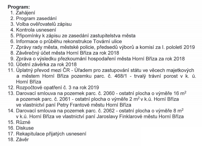 Zveme Vás na zasedání Zastupitelstva města Horní Bříza, které se uskuteční v jídelně základní školy Horní Bříza ve středu 26. června 2019 od 18:00. Hlavním bodem je závěrečný účet města za rok 2018, informace o průběhu rekonstrukce Tovární ulice. Své zprávy o činnosti předloží všechny komise, výbory, rada města i městská policie za 1.pololetí roku 2019. Pro zájemce je zajištěn svoz v 17:35 od kulturního domu Klub a zpět po skončení zasedání.