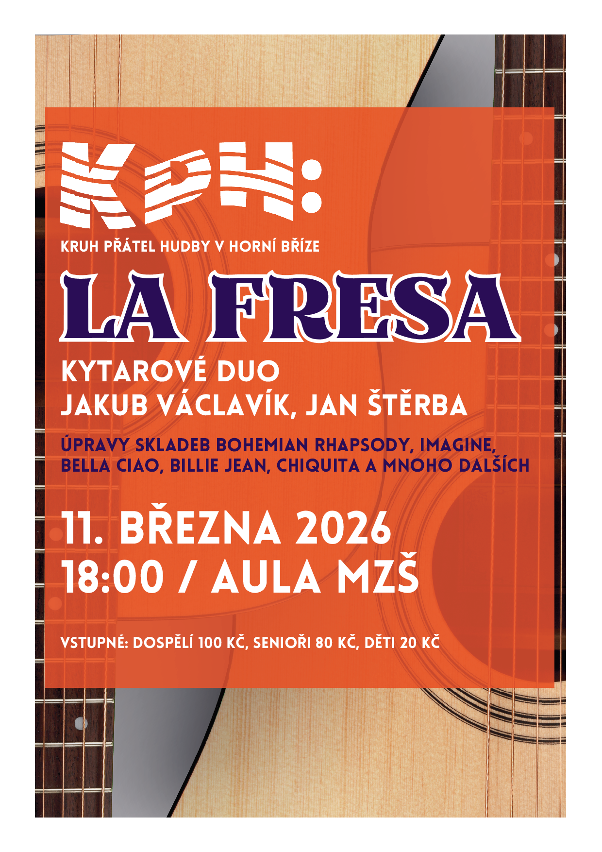 Kruh přátel hudby v Horní Bříze zve na koncert kytarového dua La Fresa ve středu 11. března 2026 od 18:00 v divadle Horní Bříza / aule školy. Všichni jste srdečně zváni.