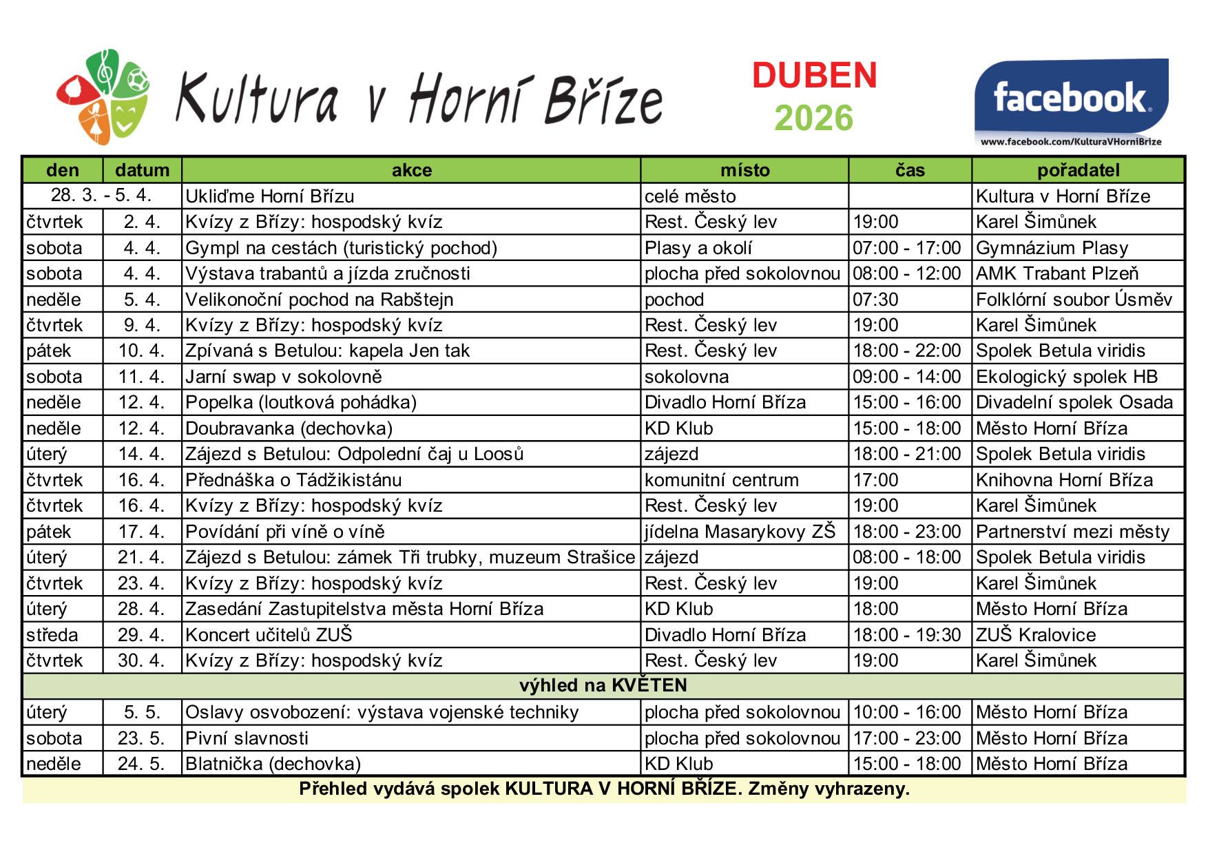 Přinášíme přehled akcí v Horní Bříze na měsíc duben s výhledem na květen.