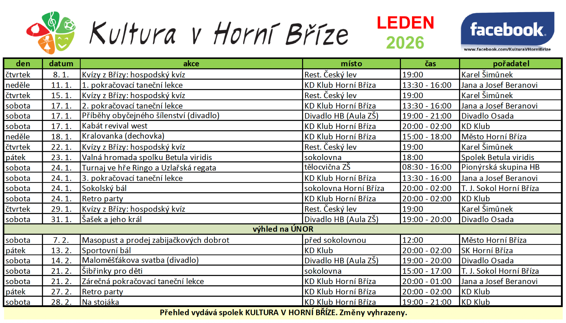 Přinášíme přehled akcí v Horní Bříze na měsíc leden s výhledem na únor.