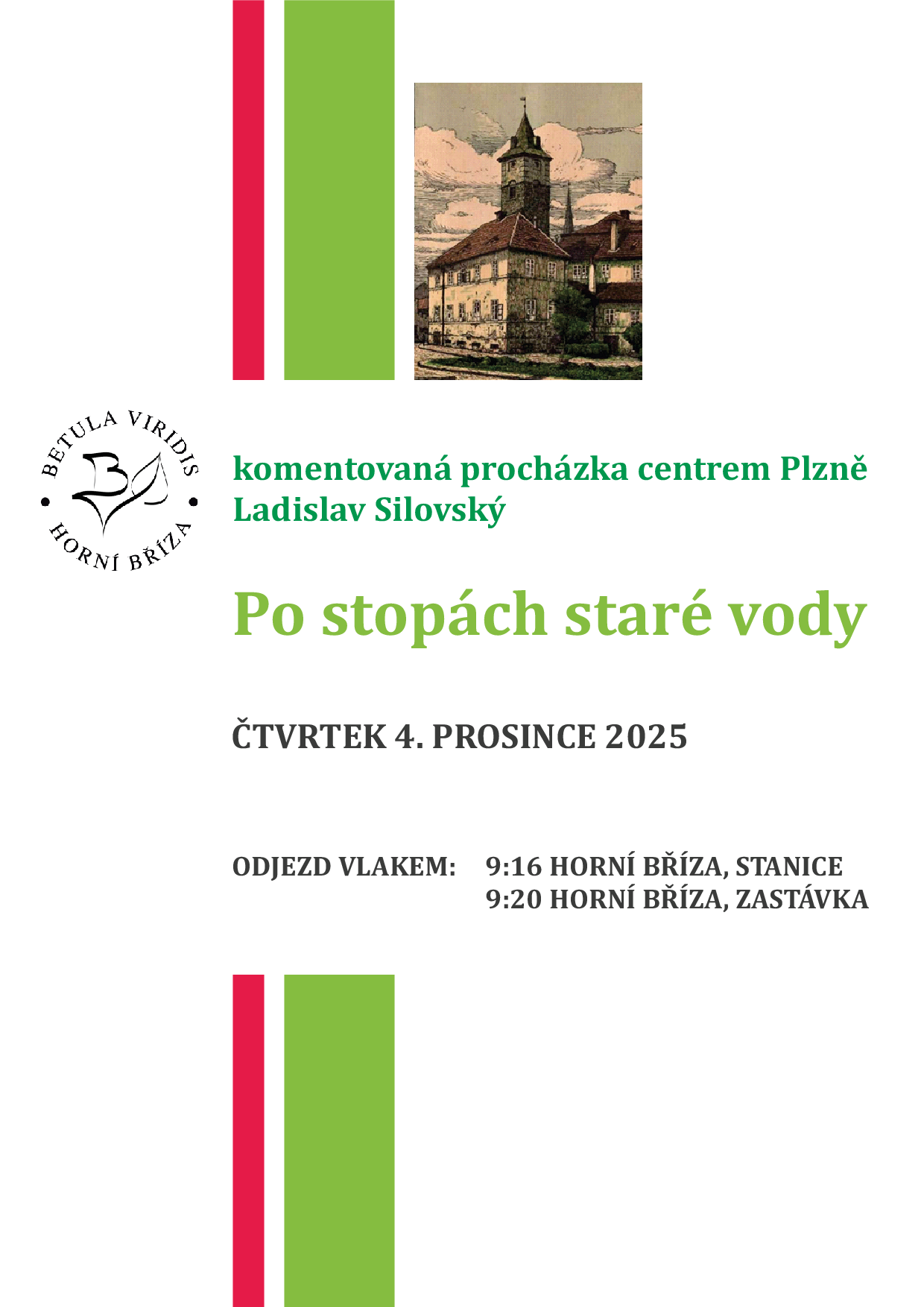 Spolek Betula viridis zve na komentovanou procházku centrem Plzně nazvanou Po stopách staré vody. Procházka se uskuteční ve čtvrtek 4. prosince 2025, sraz je u vlaku v 9:15. Všichni jste srdečně zváni.