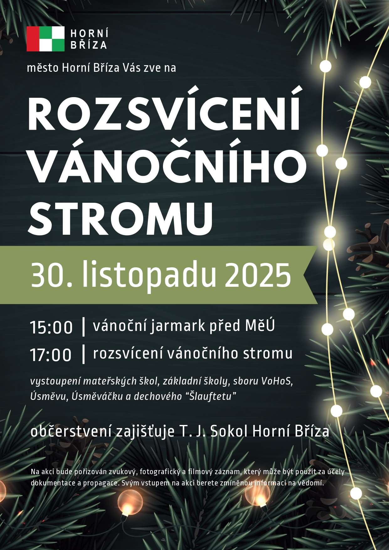 Město Horní Bříza Vás zve na rozsvícení vánočního stromu, které se koná v neděli 30. listopadu 2025 od 17:00 hodin před radnicí. Vystoupí školky, škola, sbor VoHoS, Úsměv, Úsměváček a dechový kvartet. Před rozsvícením se od 15:00 koná před radnicí vánoční jarmark. Občerstvení zajištěno.