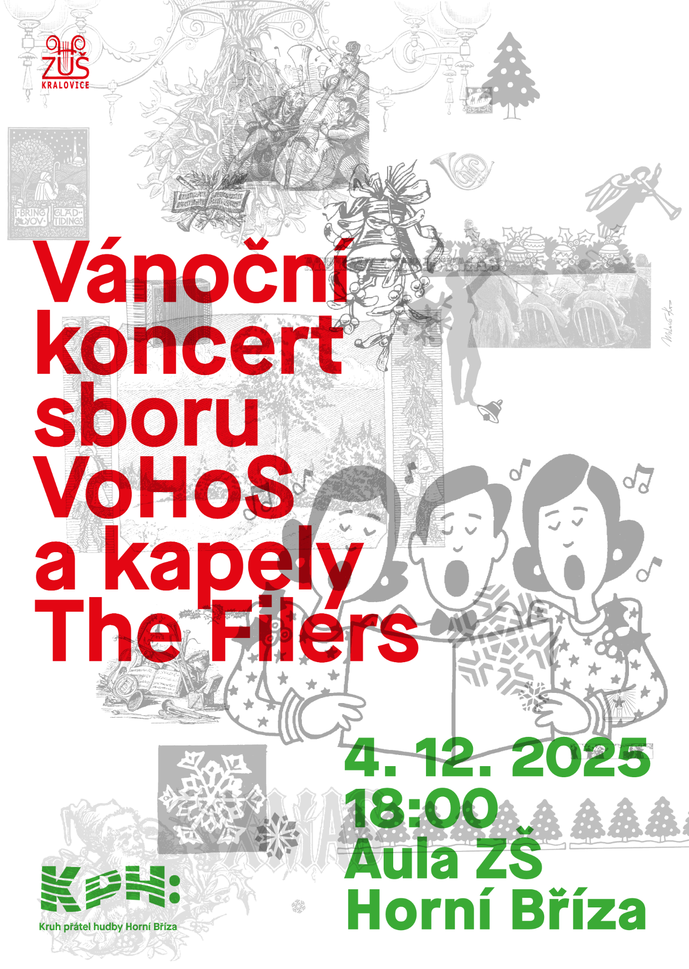 Kruh přátel hudby a Základní umělecká škola Kralovice zvou na Vánoční koncert sboru VoHoS a kapely The Filers, který se uskuteční v aule školy/divadle Horní Bříza ve čtvrtek 4. prosince 2025 od 18:00. Všichni jste srdečně zváni.