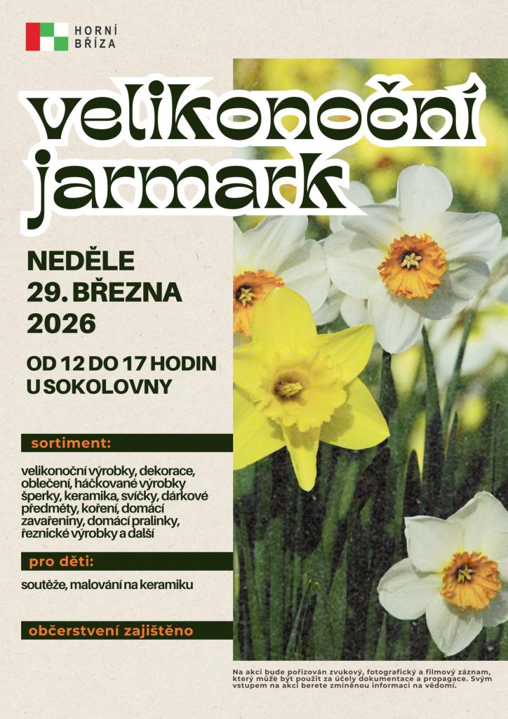 Město Horní Bříza zve na Velikonoční jarmark, který se uskuteční v neděli 29. března 2026 od 12:00 do 17:00 u sokolovny. Pro děti jsou přichystané soutěže a malování na keramiku. Občerstvení zajištěno.
